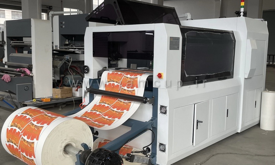 در مرحله بعد کاغذ های مخصوص چاپ لیوان کاغذی که از قبل برش خورده و سایز آن تنظیم برای فرم ارسالی لیوان کاغذی میباشد را همراه با زینک های تهیه شده از فرم ارسالی لیوان کاغذی در دستگاه چاپ قرار داده و شروع به چاپ فرم لیوان کاغذی میکنیم.